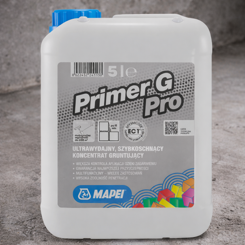 Mapei Primer G PRO je rýchloschnúci základný penetračný náter bez obsahu rozpúšťadla. Pre zjednotenie nasiakavosti, spevnenie povrchu a výrazné zvýšenie prídržnosti ďalších vrstiev k podkladu sa používa v zriedenom stave s výdatnosťou 1l = 40m2.. Pri chemicky nekompatibilných podkladoch ( napr. cement - sadra ) sa používa v neriedenom stave so spotrebou cca 1l = 7m2. Je vhodný do interiéru aj exteriéru. Primer G PRO sa odporúča používať pred aplikáciou materiálov Ultraplan Renovation, Topcem Pronto C25, Adesilex P9, Keraflex Extra S1 a Ultralite S2.